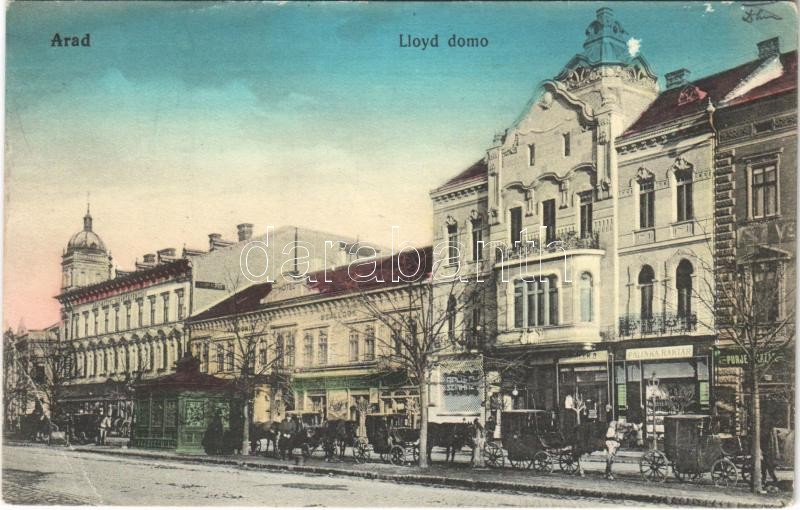 Arad, Lloyd palota, Apollo színház, mozi, pálinka raktár, Purjes üzlete, Pannonia szálloda, Takarékpénztár, lovashintók / palace, theatre, cinema, shops, hotel, savings bank, horse-drawn carriages (EB)