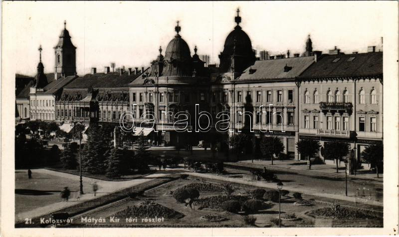 Kolozsvár, Cluj; Mátyás király tér, Erdélyi bank és takarékpénztár rt., Máramarosi bank, Olasz-Román Kereskedelmi bank, Heiler, Lepage könyvesboltja, üzlete, Corso kávéház / square, shops, cafe, banks