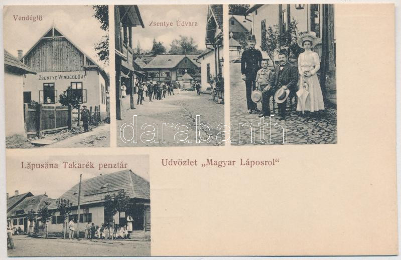 Magyarlápos, Magyar Lápos, Targu Lapus; Zsentye vendéglője és udvara, Lapusana Takarékpénztár. Häusler fényképész kiadása / restaurant, savings bank (EK)