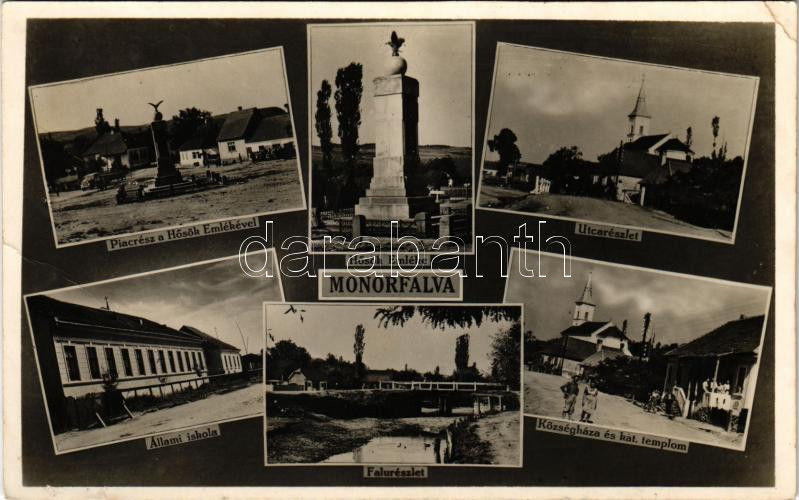 Monorfalva, Mindendorf, Monor; Hősi Emlék, Állami iskola, Községháza, Római katolikus templom, utca, falurészlet / market, heroes' monument, school, town hall, church, street, village (Rb)