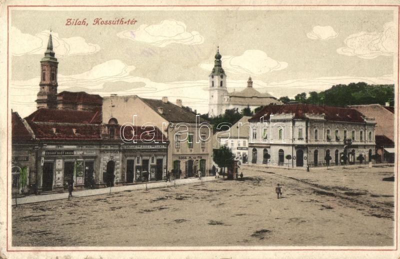 Zilah, Zalau; Kossuth tér, Dohány nagy áruda, templomok, Seres Lajos, Seres Samu, Éder M. és fia és Nagy Árpád üzlete, fodrász, könyvnyomda. Seres Samu kiadása / square, shops, printing shop, hairdresser (EK)