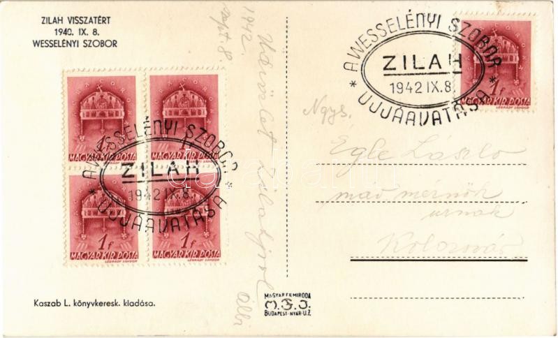 Zilah, Zalau; Wesselényi szobor. Kaszab L. kiadása / statue, monument + "1942 A Wesselényi szobor ujjáavatása" So. Stpl.