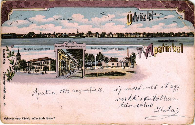 1902 Apatin, látkép, Templom és polgári iskola, Szavadill könyvnyomdája, Aman József és Társa féle sörfőzde, sörgyár. Schwidernoch Károly műintézete / general view, church, school, publishing house, brewery. Art Nouveau, floral, litho (kopott sarkak / worn corners)