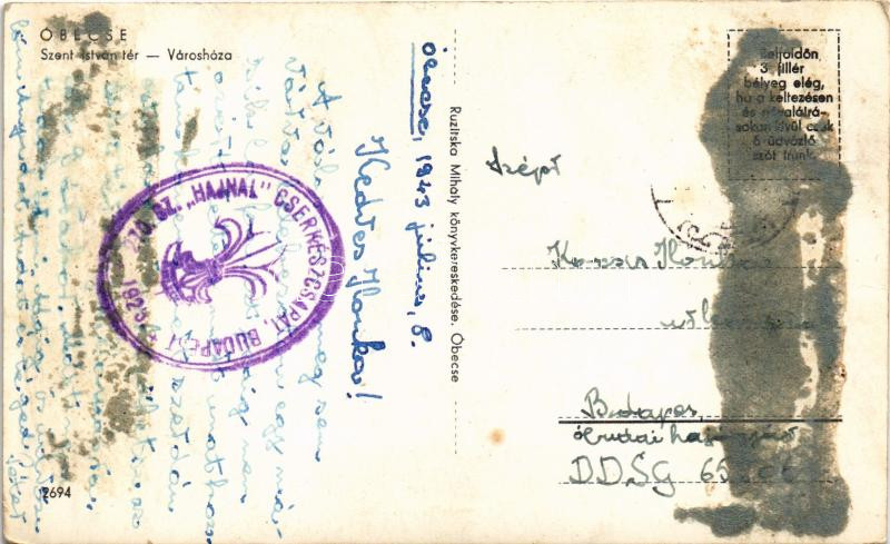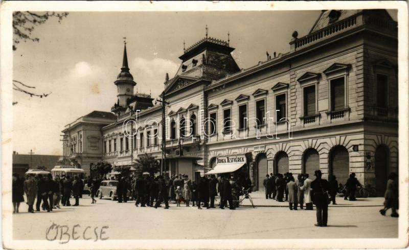 1943 Óbecse, Stari Becej; Szent István tér, Városháza, Janek Testvérek, Hubert Izidor üzlete, autóbusz, automobil, kerékpár. Ruzitska Mihály kiadása / square, town hall, shops, automobile, bicycle + "270. sz. "Hajnal" Cserkészcsapat Budapest" (ragasztónyom / glue marks)