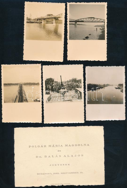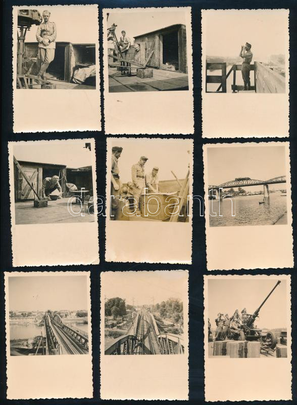 Description: cca 1942 A 101. légvédelmi század 4. ütege által kezelt 36. M. 40 mm-es Bofors gépágyú az Északi összekötő vasúti híd pillérjének tetejére telepített lövőállásban, 14 db ritka unikális fotó, jó állapotban, 9×6 cm