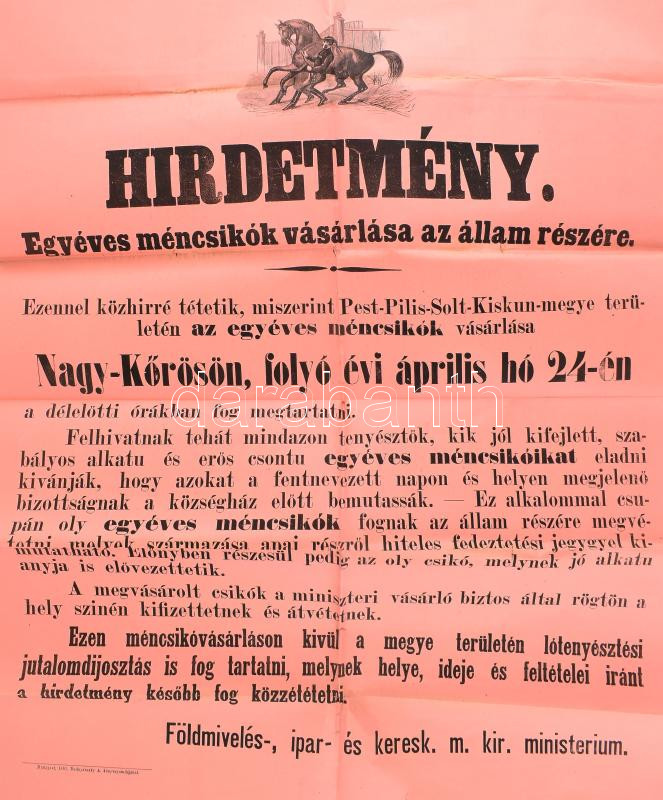 cca 1860 Hirdetmény egyéves méncsikók vásárlására Nagykőrösön. Plakát ...