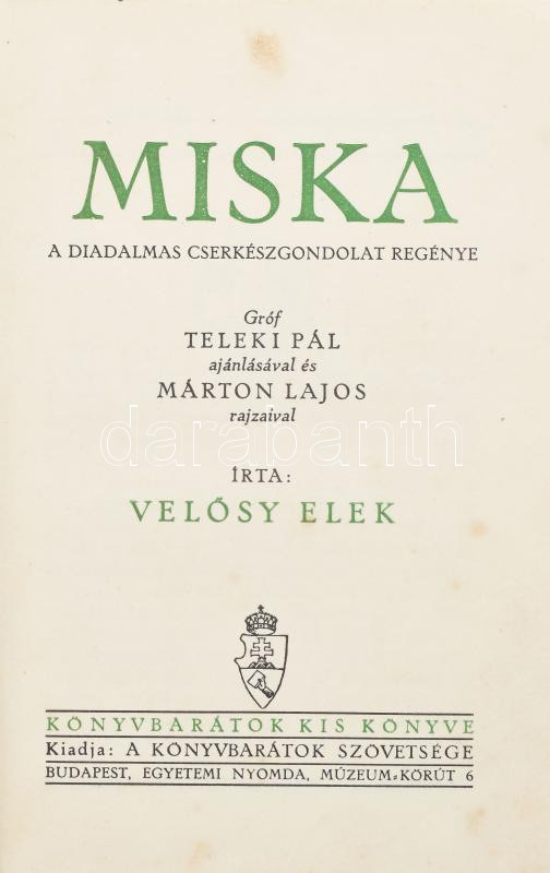 Description: Velősy Elek: Miska. A diadalmas cserkészgondolat regénye. Gróf Teleki Pál ajánlásával és Márton Lajos rajzaival. Könyvbarátok Kis Könyve. Bp.,én., Könyvbarátok Szövetsége,(Egyetemi-ny.), 206 p. Kopott, foltos félvászon-kötésben, kissé foltos lapokkal.
