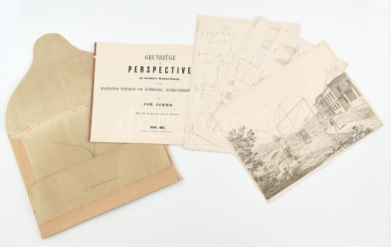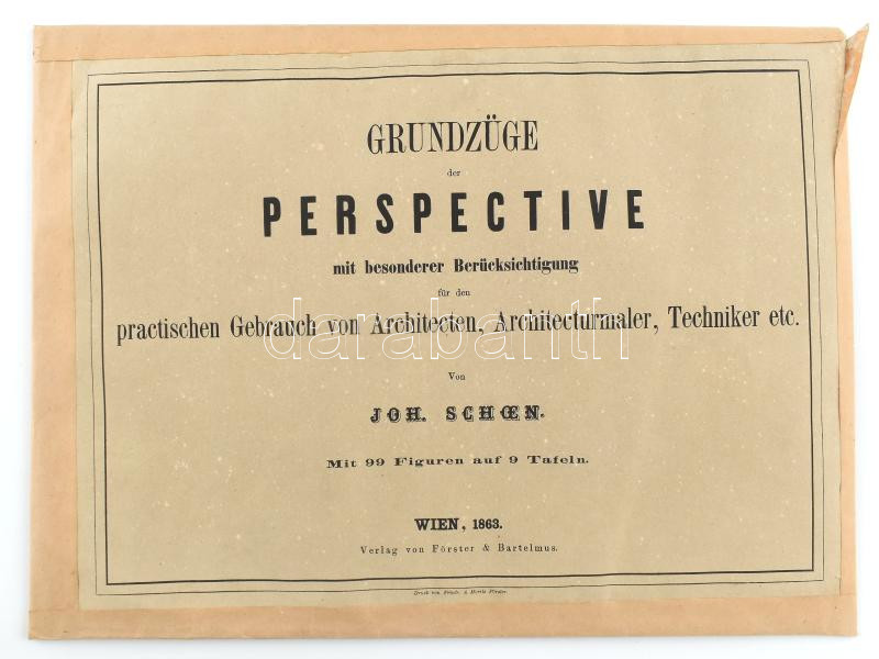 Description: [Johann Schön] Joh. Schoen: Grundzüge der Perspective mit besonderer Besichtigung für den praktischen gebrauch von Architekten, Architekturmaler, Techniker etc. Wien, 1863. Förstner és Bartelmus. Mit 99 Figuren auf 9 Tafeln. 32p + 9 tt Korabeli, javított papírborítékban.