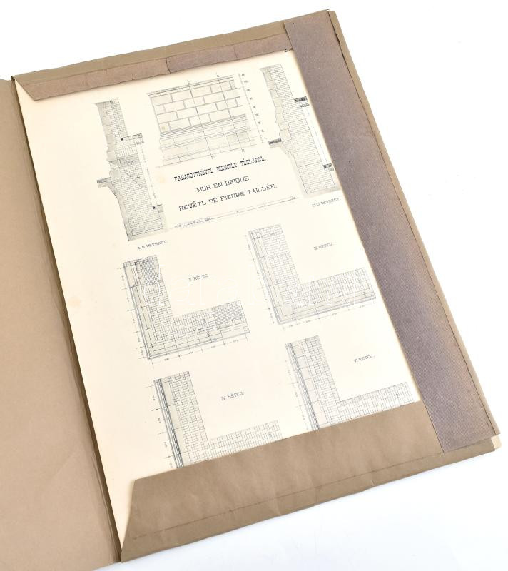 Description: Pecz Samu: Középítési szerkezetek. Budapest, 1911 M. Kir. József Műegyetemi Segélyegylete. Klösz Gy. nyomda. 19 db nagy méretű tábla 2-20. Javított papírmappában 30x41 cm