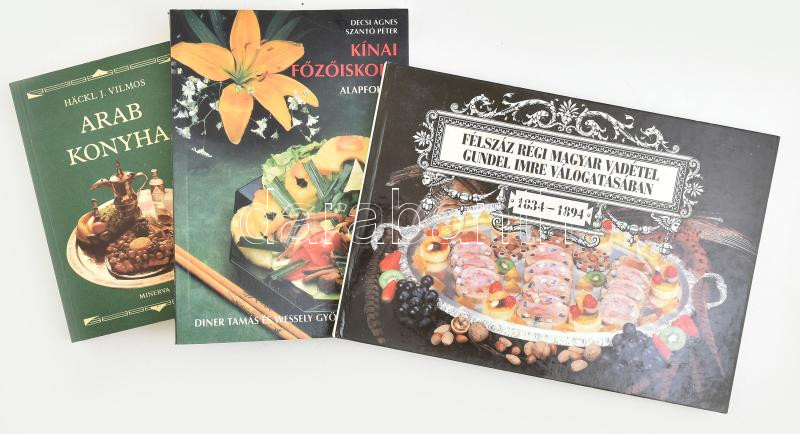 3 db szakácskönyv - Arab konyha, Kínai főzőiskola, Félszáz régi magyar vadétel Gundel Imre válogatásában. Változó kötésben, jó állapotban.