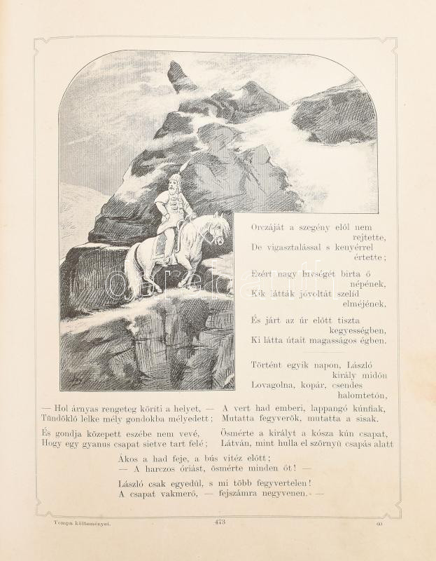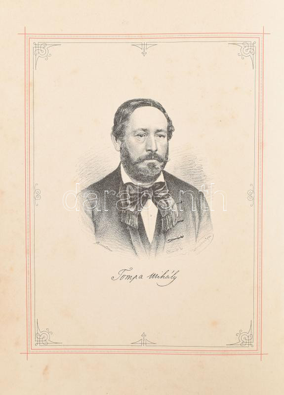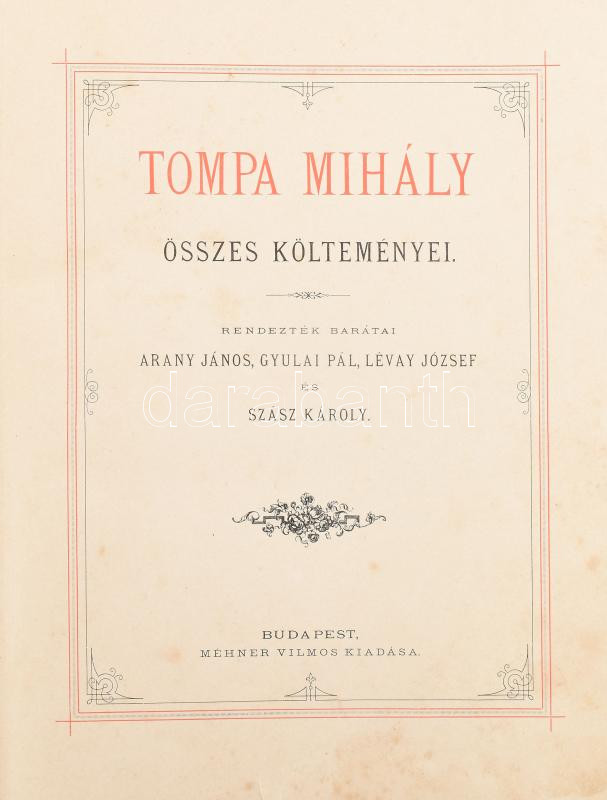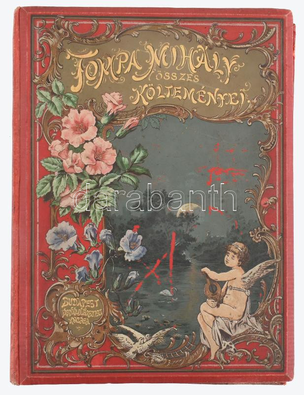 Tompa Mihály összes költeményei. Ügynöki mintapéldány! Szemelvények az eredetileg 807 oldalas műből. Rendezték barátai Arany János, Gyulai Pál, Lévay József és Szász Károly. Bp., 1870., Méhner Vilmos. Gazdag képanyaggal illusztrált. Kiadói dúsan aranyozott, festett illusztrált egészvászon-kötés, a borítón kopásnyomokkal, a gerinc foltos, és a hátsó borító foltos, piszkos, két lap kijár.