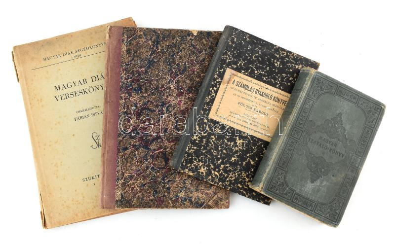 Vegyes tankönyv tétel, 4 db: Bárány Ignác: Tanítók könyve. Kalauz a nevelés és a tanítás vezetésére. Bp., 1876., Lauffer Vilmos. Negyedik kiadás. Átkötött kopott félvászon-kötés, a gerincen sérüléssel, néhány foltos lappal.; Földes Károly: A számolás gyakorlókönyve. Az elemi népiskola IV. osztálya számára. Bp., 1906., Athenaeum. Átkötött kopott félvászon-kötés.; Magyar diák verseskönye. Összeáll.: Fábián István. Magyar Diák Segédkönyvei 1. szám. [Pécs], 1943., Szukits. Kiadói papírkötés, foltos borítóval, a gerincen szakadásal. Magyar szavaló-könyv. Válogatott költemények. Az elemi fiú- és leányiskolák I. és II. osztályú növendékeinek számára, valamint magánhasználatra. I-V. füzet. [Egybekötve.] Összeáll.: Győrffy János. Bp., 1903., Szent István-Társulat. Kiadói kopott egészvászon-kötésben, laza kötéssel, foltos lapokkal.;