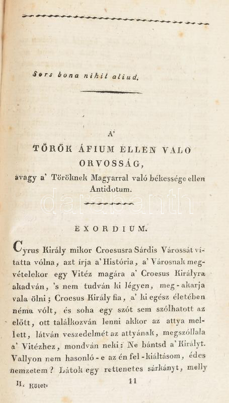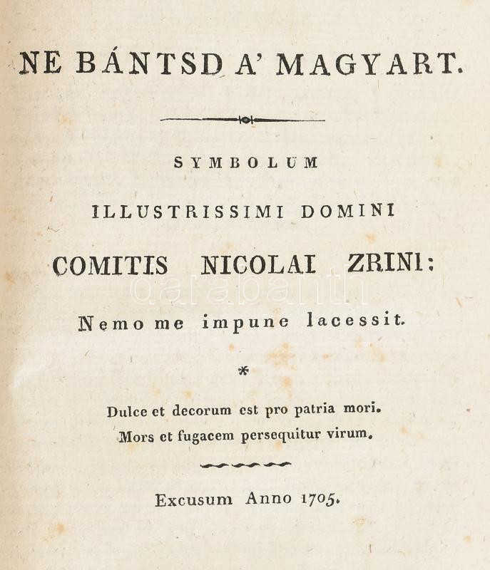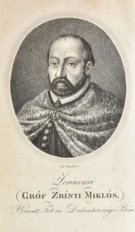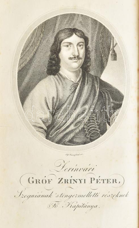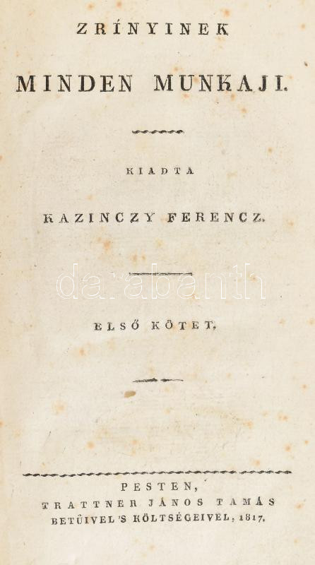 Zrínyi Miklós: Zrínyinek minden munkáji. I-II. köt. Kiadta Kazinczy Ferenc. I. kötet: A Zríniász, vagy az ostromlott Sziget. Hős költemény. 1-10. ének. II. kötet: A Zríniász vagy az ostromlott Sziget. Hős költemény 11-15. ének. Elegyes versezetek. Ne bánts a' magyart. A török áfium ellen való orvosság, avagy a töröknek magyarral való békessége ellen való antidotum. Pest, 1817., Trattner János Tamás, 1 (Zrínyi Miklós rézmetszetű portréja, J. G. Mansfeld) t. +189+1 p.; 1 (Zrínyi Péter rézmetszetű portréja, J. G. Mansfeld) t. + 205 p. Első kiadás. Kartonált papírkötés, a gerinc és a hátsó tábla alján a papírborítás részben hiányzik, kissé foltos lapokkal, ceruzás aláhúzásokkal.