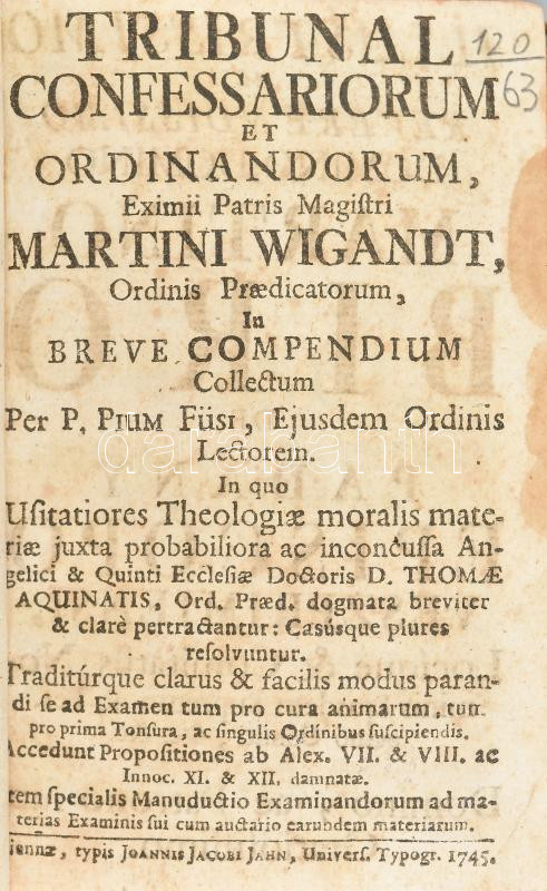 Martin Wigandt: Tribunalis Confessariorum et Ordinandorum. Viennae, 17... https://www.darabanth.com/en/433-Online-auction/433.0/Books/Books-Religion~1000020/Martin-Wigandt-Tribunalis-Confessariorum-et-Ordinandorum-Viennae-1745-Johannis-Jacobi-Jahn-621~II2796926