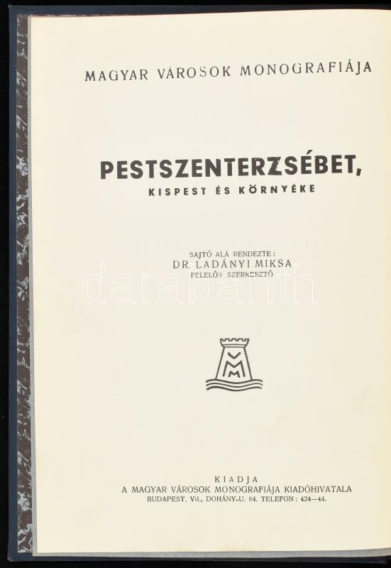 Pestszenterzsébet, Kispest és környéke. Sajtó alá rendezte Dr. Ladányi Miksa. Dr. Chickán Béla polgármester előszavával. Magyar Városok Monografiája XVIII. köt. Bp., 1936., Magyar Városok Monografiája, 330+1 p. Benne az eredeti számlával, és egy modern, fénymásolt térképpel. Kiadói aranyozott, egészvászon-kötés, a 8 képtábla hiányzik.