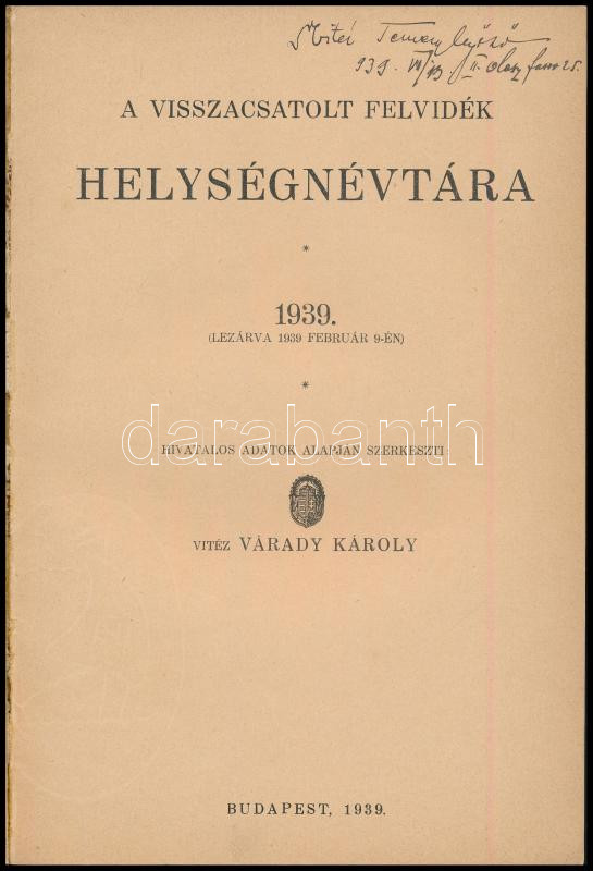 https://www.darabanth.com/en/433-Online-auction/433.0/Books/Books-Travelling-Local-History~1000005/Vitez-Varady-Karoly-A-visszacsatolt-Felvidek-helysegnevtara-Bp-1939-Hornyanszky-Kiado~II2794860