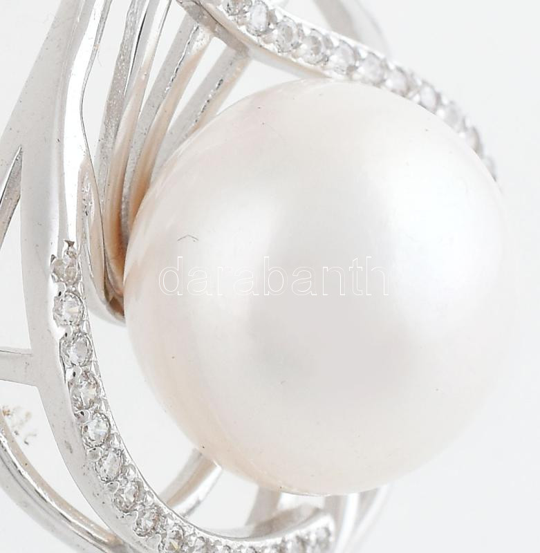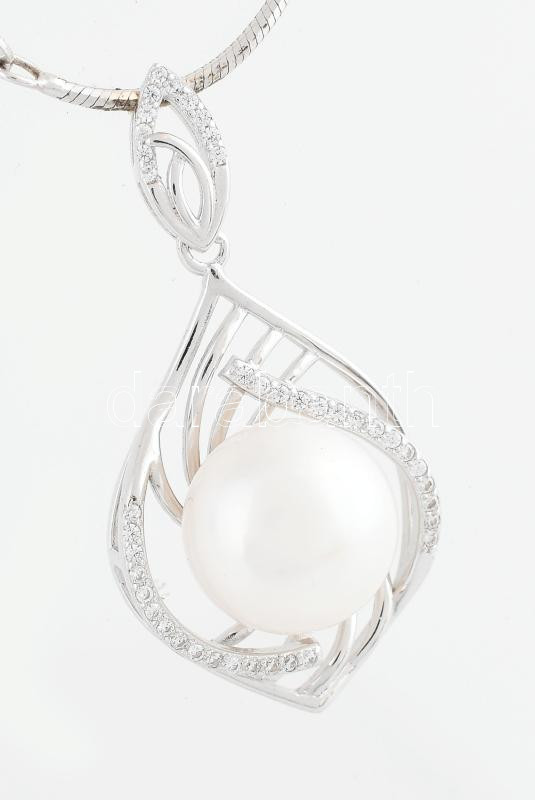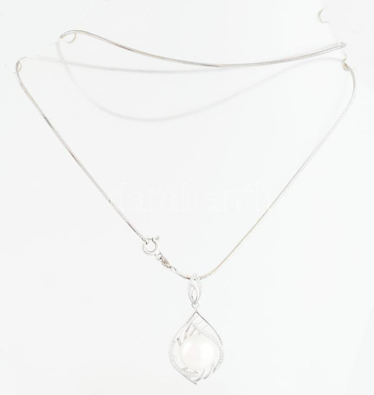Ezüst(Ag) szögletes kígyó nyaklánc nagyméretű tenyésztett gyöngy medállal, jelzett, h: 54 cm, bruttó: 10 g