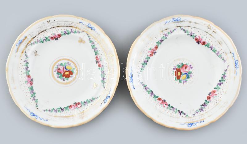 3 db kézzel festett, antik porcelán tányér, kopottak, d: 19 cm