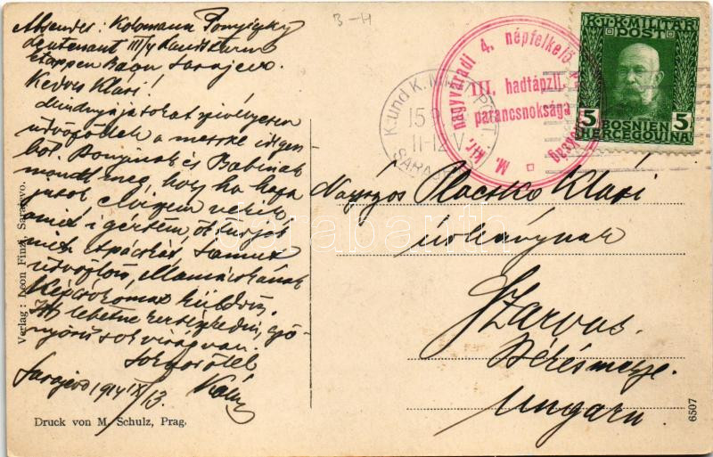 Description: 1914 Sarajevo, Residencija Reis ul-uleme + "K. und K. Milit. Post Sarajevo" + "M. kir. nagyváradi 4. népfelkelő parancsnokság III. hadtápzlj. parancsnoksága"