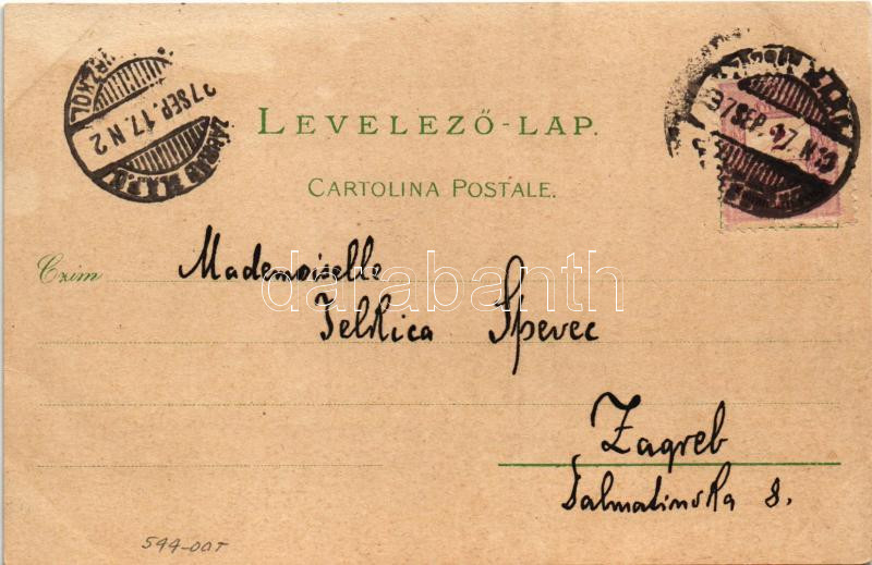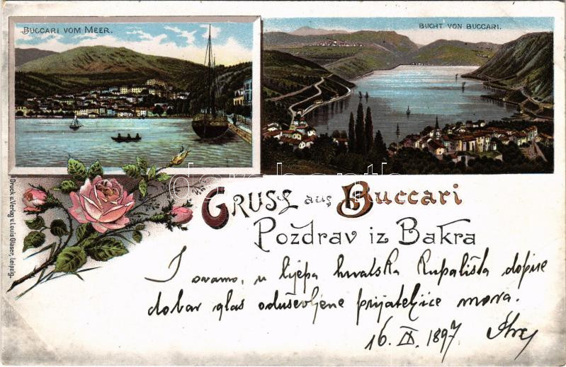 1897 (Vorläufer!) Bakar, Szádrév, Bukar, Bukkari, Buccari; Buccari vom Meer, Bucht von Buccari / látkép, öböl / general view, bay. Druck u. Verlag v. Louis Glaser Art Nouveau, floral, litho