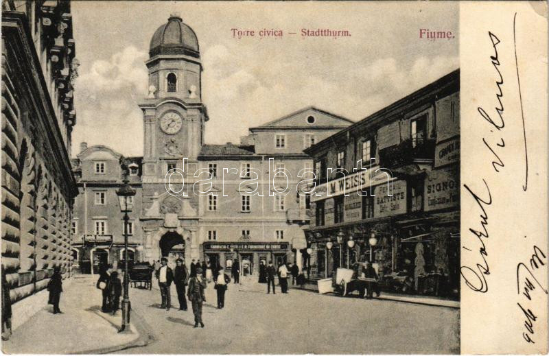 1906 Fiume, Rijeka; Torre civica, M. Weiss, Battiste, Farmacia / Stadtthurm / clock tower, pharmacy, shops. Divald Károly 1084. (EK)