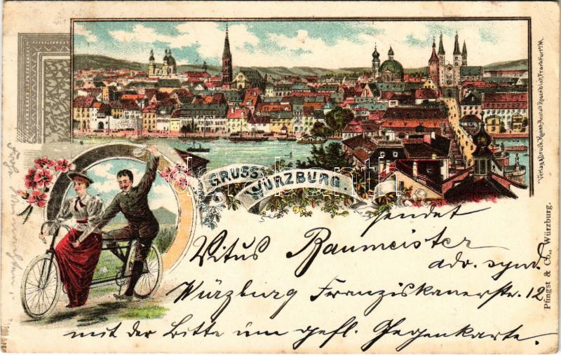 1899 (Vorläufer) Würzburg, general view, couple riding a tandem bicycle. Kunst-Anstalt Rosenblatt Art Nouveau, floral, litho (EK)