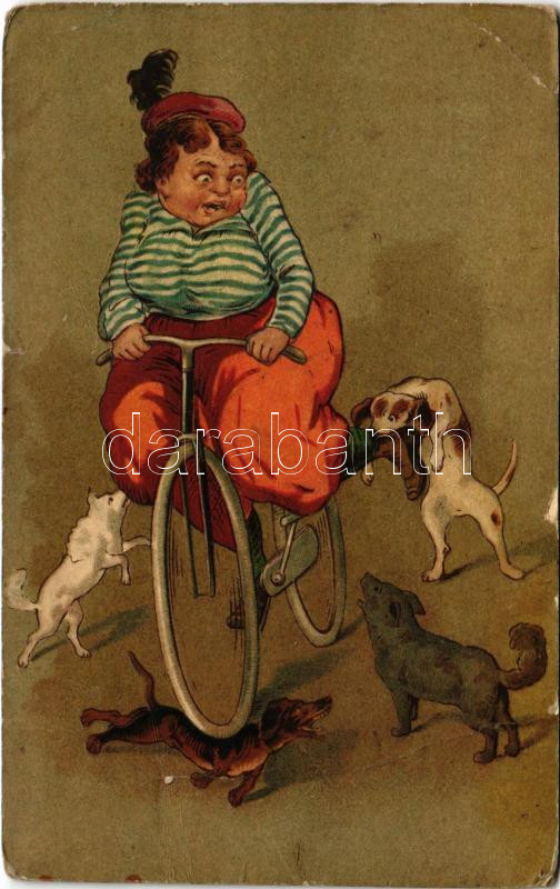 1920 Kerékpározó hölgy kutyatámadás közben. Dombornyomott / Dogs attac...