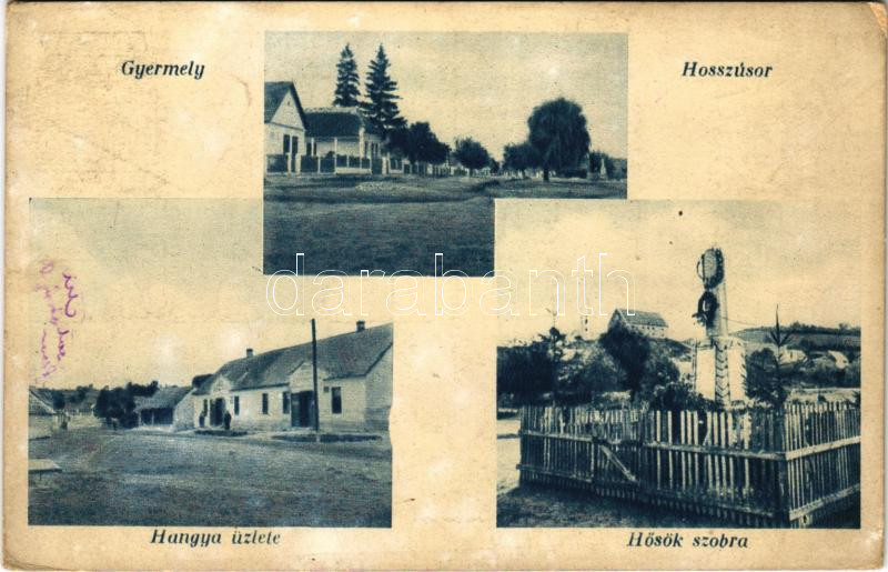 1940 Gyermely, Hosszúsor, Hősök szobra, Hangya üzlete + "POSTAI Ü...