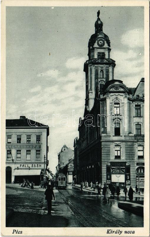 Pécs, Király utca, Nagyáruház, Páll Ödön üzlete, gyógyszertár, villamos