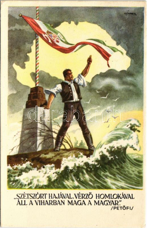Description: 1939 Szétszórt hajával, vérző homlokával áll a viharban maga a magyar. Kiadja az Ereklyés Országzászló Nagybizottsága / Hungarian irredenta propaganda, Hungarian flag, Treaty of Trianon s: Lamoss (EK)