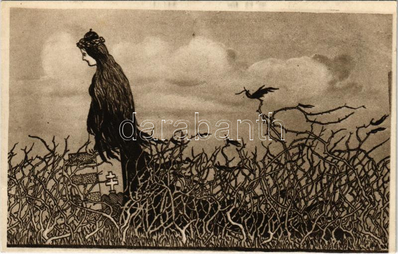 Description: Tövises úton vándorol Hungária ezer év óta. Kiadja a "Szózat" Magyarország Területi Épségének Védelmi Ligája napilapja / "Hungary since a thousand years is treading her thorny way" Hungarian irredenta propaganda art postcard, Trianon s: Wéber József (EB)