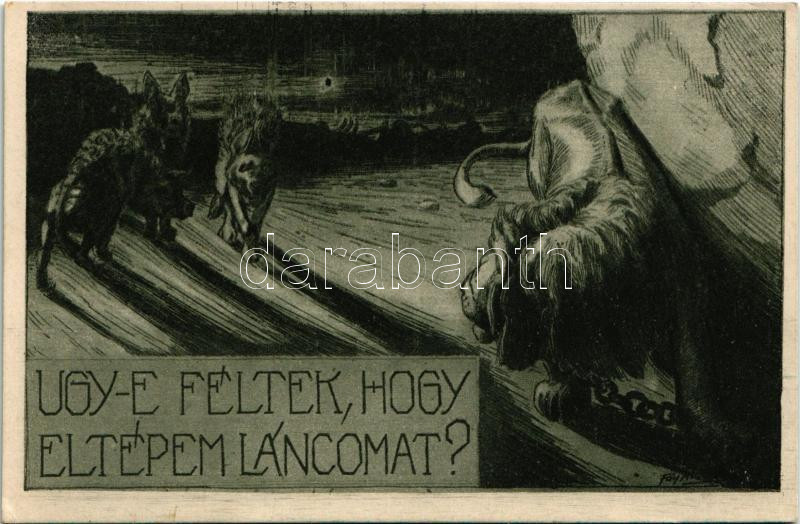 Description: Ugye féltek, hogy eltépem láncomat? Kiadja a "Szózat" Magyarország Területi Épségének Védelmi Ligájának napilapja / "They fear the Hungarian Lion will break his fetters" Hungarian irredenta propaganda, Trianon s: Ifj. Fáy Aladár