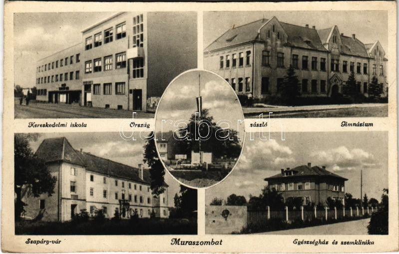 Muraszombat, Murska Sobota; Kereskedelmi iskola, Országzászló, Gimnázium, Szapáry vár, kastély, Egészségház és szemklinika / commercial school, Hungarian flag, high school, castle, hospital and eye clinic