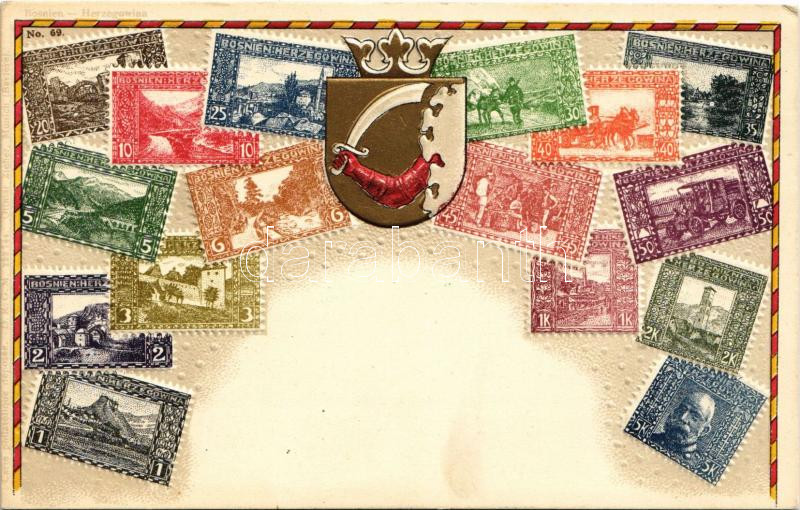Description: Bosnien-Herzegowina / Bosznia-Hercegovina bélyegei. Szecessziós dombornyomott litho, címer / Stamps and coat of arms of Bosnia and Herzegovina. Carte philatélique. Ottmar Zieher Emb. Art Nouveau litho (lyuk / pinhole)