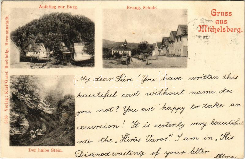 Description: 1899 (Vorläufer) Kisdisznód, Michelsberg, Cisnadioara; Aufstieg zur Burg, Evang. Schule, Der halbe Stein / feljárat a várhoz, evangélikus iskola. Karl Graef 3856. / path to the castle, Lutheran school
