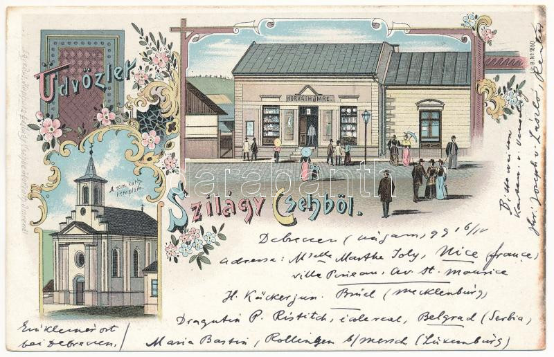 Description: 1899 (Vorläufer) Szilágycseh, Cehu Silvaniei; Római katolikus templom, Horváth Imre üzlete és saját kiadása / Catholic church, publisher's shop. Art Nouveau, floral, litho