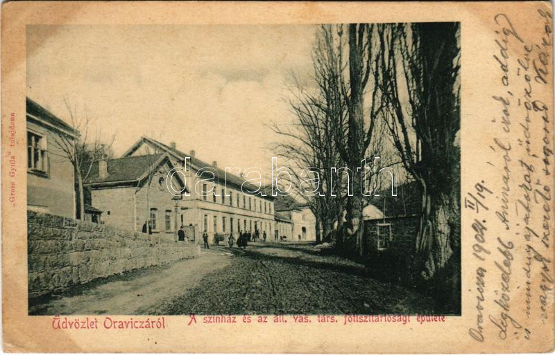 Description: 1902 Oravicabánya, Oravica, Oravicza, Oravita; Az állami vasúti társaság főtiszttartósági épülete (igazgatósága) és a színház. Gross Gyula kiadása / state railway directorate building and the theatre (kis szakadás / small tear)