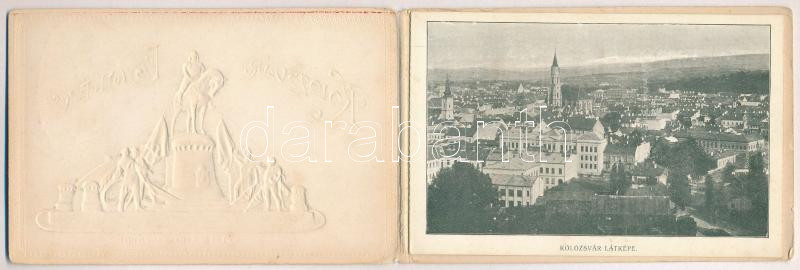 Kolozsvár, Erdély; Kolozsvári Emlék. Mátyás király szobor. Kinyitható üdvözlő füzet 1 képeslappal szecessziós dombornyomott borítóval / folding greeting booklet with 1 postcard. Art Nouveau, Emb. cover (EK)