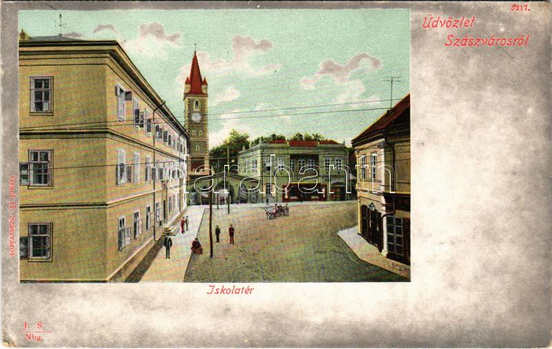 Szászváros, Broos, Orastie; Schulplatz / Iskola tér, gyógyszertár. H. ...