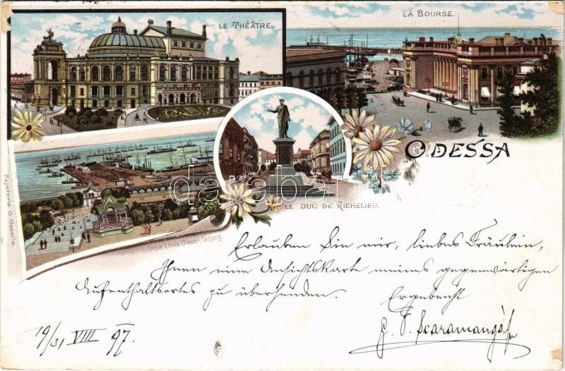 Description: 1897 (Vorläufer) Odessa, Odesa; Le Theatre, La Bourse, Le Duc de Richelieu / theatre, stock exchange, statue. G. Geselle Art Nouveau, floral, litho (Rb)