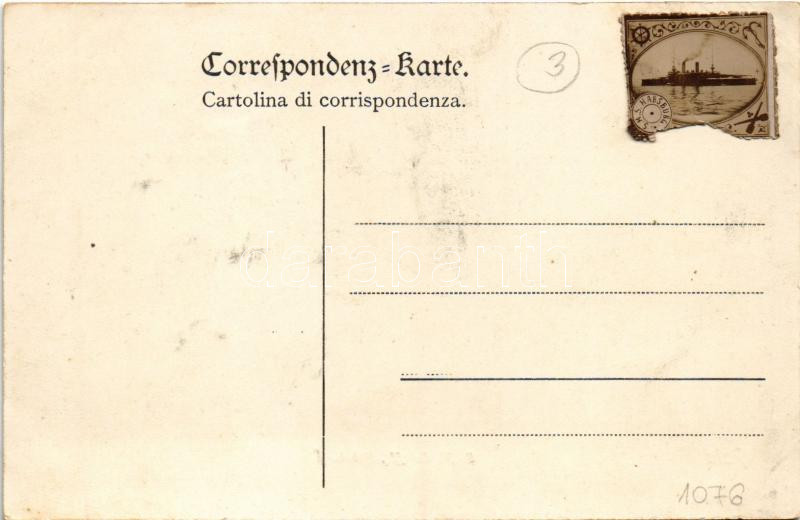 Description: Pola, SMS Habsburg az Osztrák-Magyar Haditengerészet Habsburg-osztályú pre-dreadnought csatahajója + a hajó bélyegje / K.u.K. Kriegsmarine. SMS Habsburg / WWI Austro-Hungarian Navy pre-dreadnought battleship SMS Habsburg + stamp (EK)