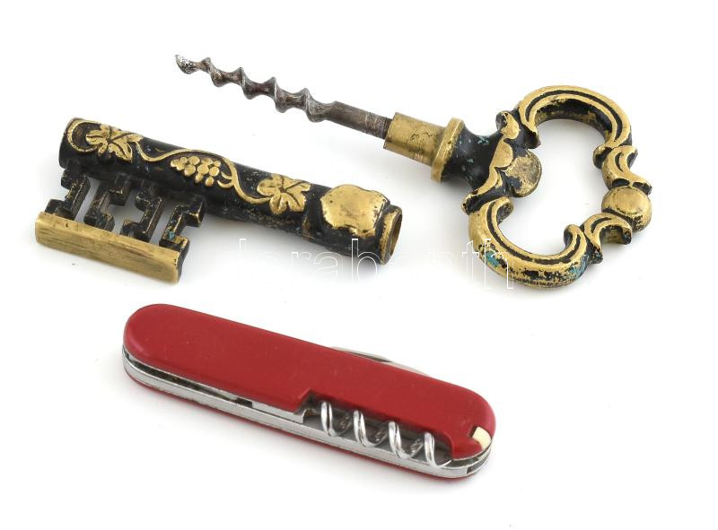 Kulcs formájú réz dugóhúzó + multifunkciós svájcibicska, h: 8-13 cm