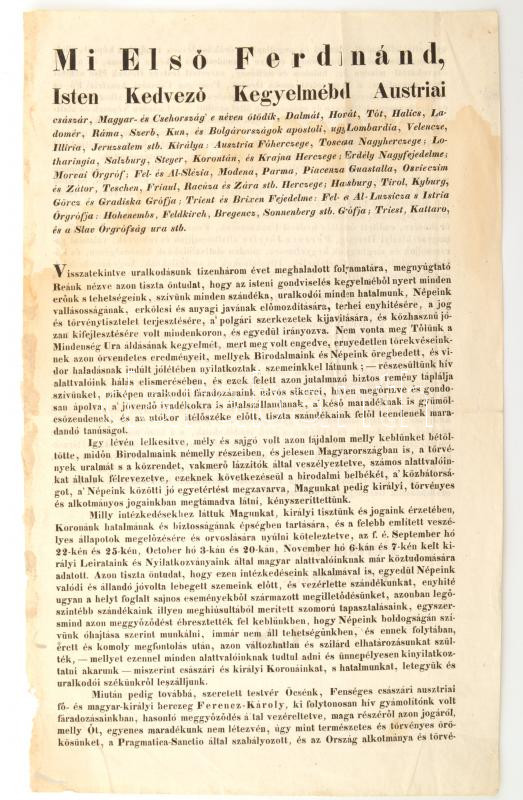 Description: 1848. december 2. Az Olmützi proklamáció, melyben V. Ferdinánd lemond a trónról, Ferenc Károly főherceg pedig a trónutódlásról Ferenc József javára. Kétoldalas nyomtatvány. / 1849 Proclamation made in Olmütz in which Ferdinand V. resigns from the throne in favor of Franz Josef.39x24 cm