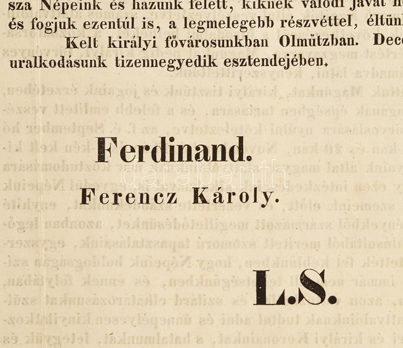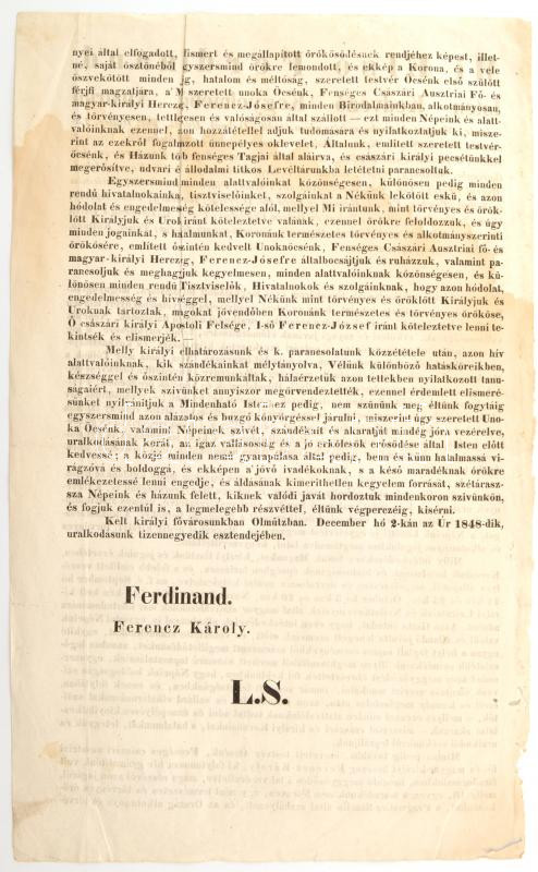 1848. december 2. Az Olmützi proklamáció, melyben V. Ferdinánd lemond ... https://www.darabanth.com/en/434-Online-auction/434.0/Art-and-other-collectibles/Historical-documents-manuscripts~500021/1848-december-2-Az-Olmutzi-proklamacio-melyben-V-Ferdinand-lemond-a-tronrol-Ferenc-Karol~II2811257