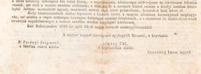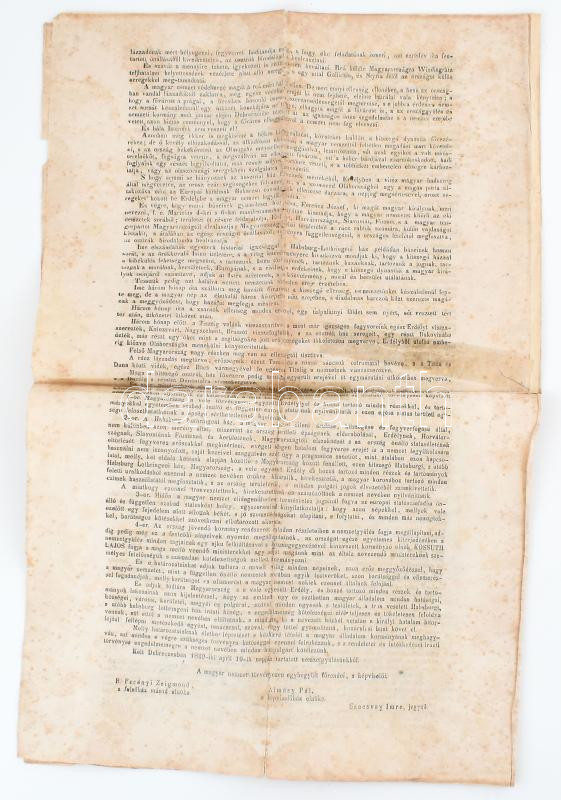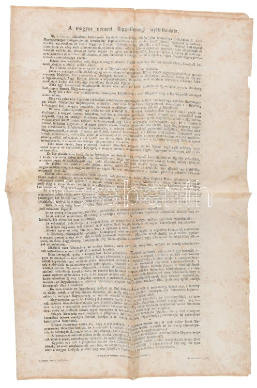1849 A Magyar Nemzet Függetlenségi Nyilatkozata. Folio. A magyar forradalom és szabadságharc alatt a debreceni Nagytemplomban, a népgyűléssé bÅ‘vült országgyűlés által 1849. április 14-én elfogadott határozat, amely kimondta Magyarország függetlenségét és a Habsburg-Lotaringiai ház magyarországi trónfosztását. A nyilatkozatot 1849. április 19-én Kossuth Lajos olvasta fel a Nagytemplomban. AláÃrói: Almásy Pál, a képviselÅ‘ház elnöke, Perényi Zsigmond a felsÅ‘ház másodelnöke és Szacsvay Imre jegyzÅ‘. Az 1848-49-es szabadságharc ritka dokumentuma. Hajtogatva, közepén ragasztott szakadással, kis lyukakkal. 44x30 cm