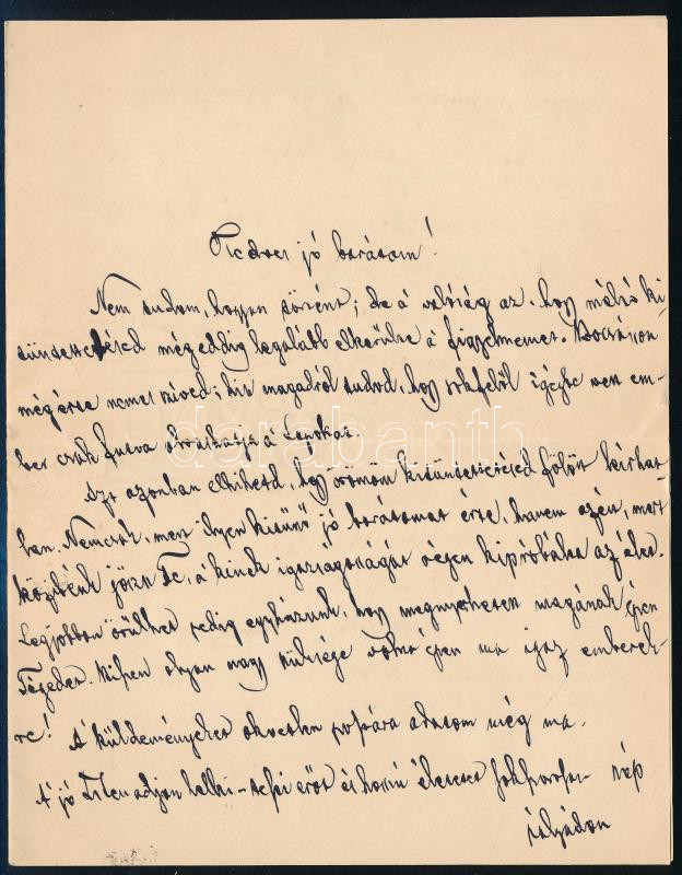Description: 1905 Debrecen, Dicsőfi József (1859-1920) ev. ref. lelkész autográf gratuláló levele, Dr. Bary József (1858-1915) vizsgálóbíró, a tiszaeszlári vérvádper vizsgálóbírója részére, autográf aláírásával. Kitüntetése alkalmából gratulál, (kir. törvényszék elnöki kinevezése? (1904.) Másfél beírt oldal.