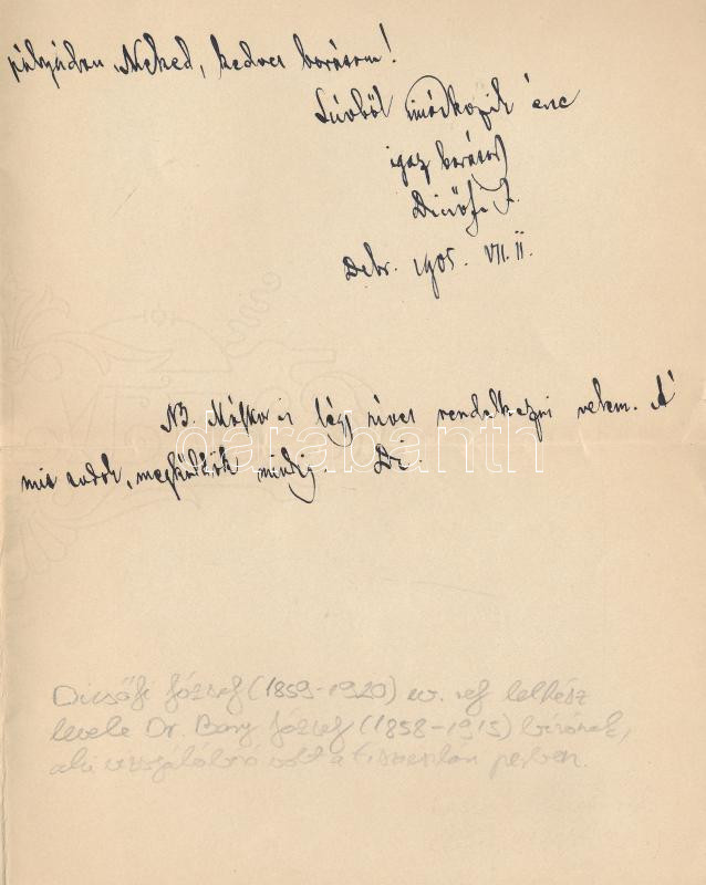 1905 Debrecen, Dicsőfi József (1859-1920) ev. ref. lelkész autográf gr... https://www.darabanth.com/en/434-Online-auction/434.0/Art-and-other-collectibles/Historical-documents-manuscripts~500021/1905-Debrecen-Dicsofi-Jozsef-1859-1920-ev-ref-lelkesz-autograf-gratulalo-levele-Dr-Bary~II2805519
