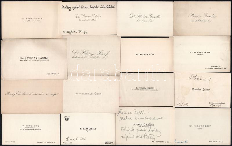 1931-1943 Bary Zoltán (1892-1986) m. kir. kúriai bíró, Bary József (1858-1915), a tiszaeszlári vérvádper vizsgálóbírója) kúriai bíró fiának névjegykártyája, valamint részére szóló névjegykártyák, 16 db, közte: Dr. Vernes István kir. ügyészségi alelnök, Dr. Révész Gusztáv kir. kúriai bíró (2 db), Dr. Grottó László kir. ügyész, Dr. Hetényi József budapesti kir. ítélőtáblai bíró, Dr. Patonay László kir. törvényszéki tanácselnök és mások, rajtuk újévi üdvözlő sorokkal.