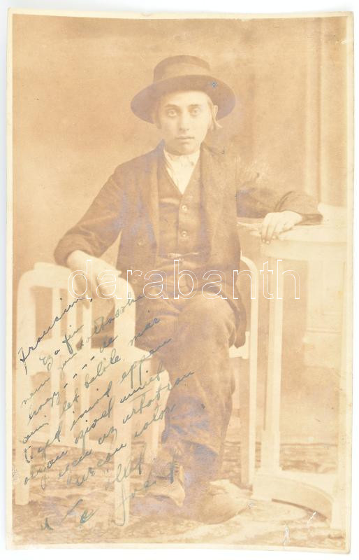 Description: Joseph (Joe) Pasternak (Paszternák József) (1901-1991) magyar származású amerikai hollywoodi filmproducer magyar nyelvű autográf dedikációval ellátott fotója fiáról.24x18 cm / Joseph (Joe) Pasternak Hungarian-American film producer in Hollywood autograph dedication on photo of his son. 24x18 cm.