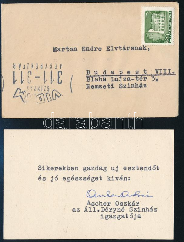 cca 1964 Ascher Oszkár (1897-1965) színész, az állami Déryné Színház igazgatója saját kézzel aláírt üdvözlőkártyája, borítékában, Marton Endre részére